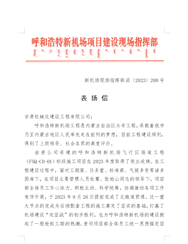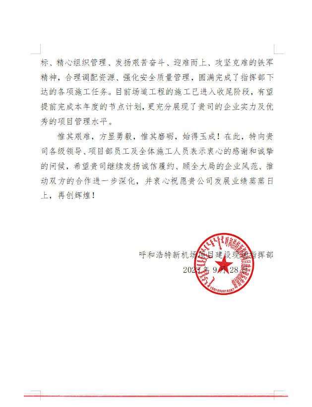 2023年9月28日,呼和浩特新機(jī)場項目建設(shè)現(xiàn)場指揮部給我司發(fā)來表揚(yáng)信,信中充分肯定了我司在呼和浩特新機(jī)場項目建設(shè)中項目部全體員工統(tǒng)一思想錨定目標(biāo)、精心組織管理、發(fā)揚(yáng)艱苦奮斗、迎難而上、攻堅克難的鐵軍精神,合理調(diào)配資源、強(qiáng)化安全質(zhì)量管理,圓滿完成了指揮部下達(dá)的各項施工任務(wù)。